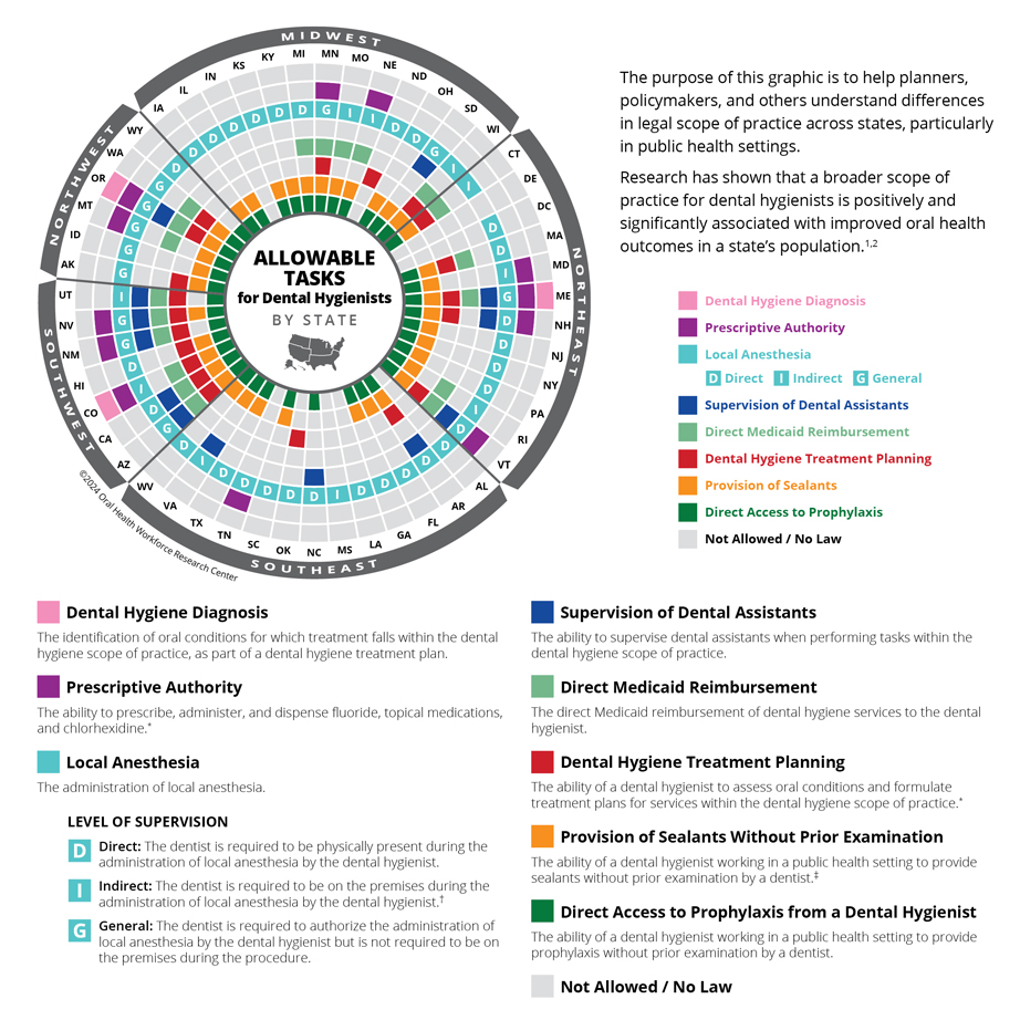 This infographic, created in 2017 with updates in 2019 and 2024, illustrates allowable tasks for dental hygienists by each state in the United States, to help planners and policymakers understand the differences in legal scope of practice across states, particularly in public health settings.